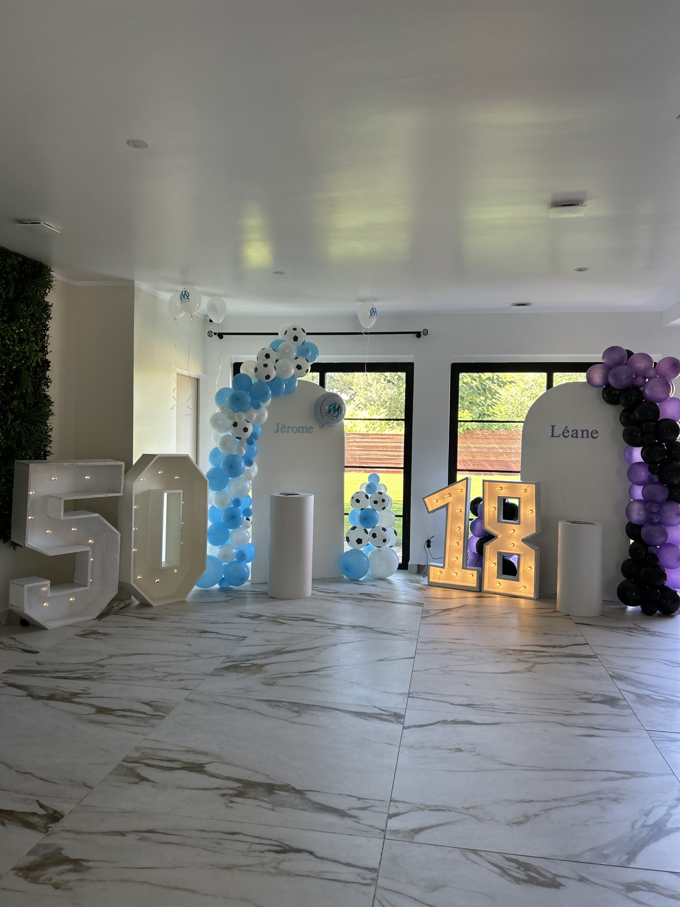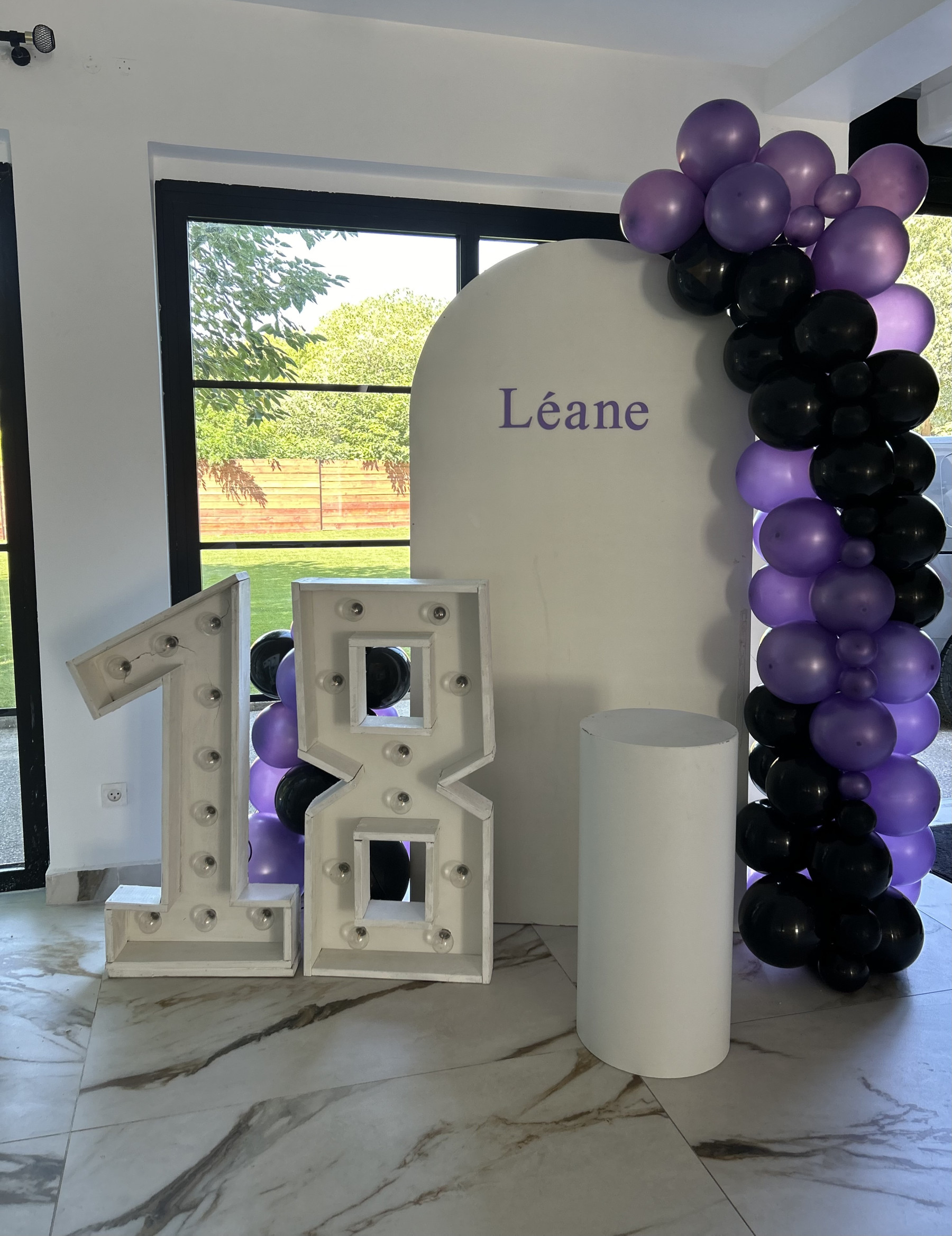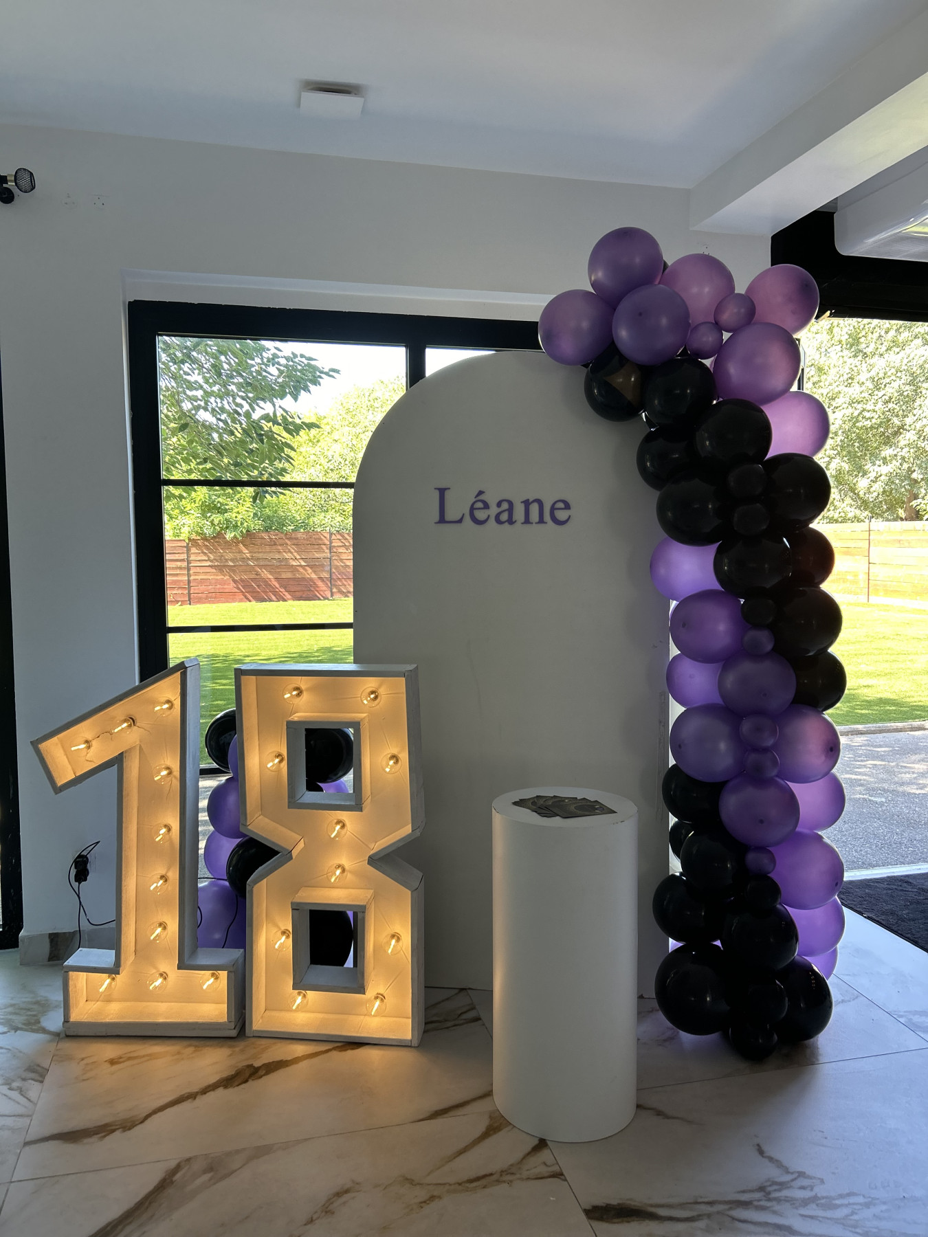 Installation d’un back drop personnalisé ainsi qu’une arche de ballon aux couleurs violet et noir.